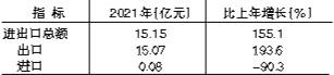 全年进出口总额15.15亿元,比上年增长155.1%。其中出口额15.07亿元,增长193.6%;进口额0.08亿元,下降90.3%。