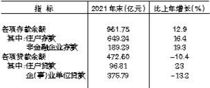 全年金融业增加值占第三产业比重12.5%。年末全市金融机构人民币各项存款余额961.75亿元,比上年增长12.9%,其中,住户存款余额649.24亿元,增长16.4%。金融机构人民币各项贷款余额472.60亿元,比上年下降10.4%,其中,住户贷款余额96.81亿元,增长2.3%;企(事)业单位贷款余额375.79亿元,下降13.2%。