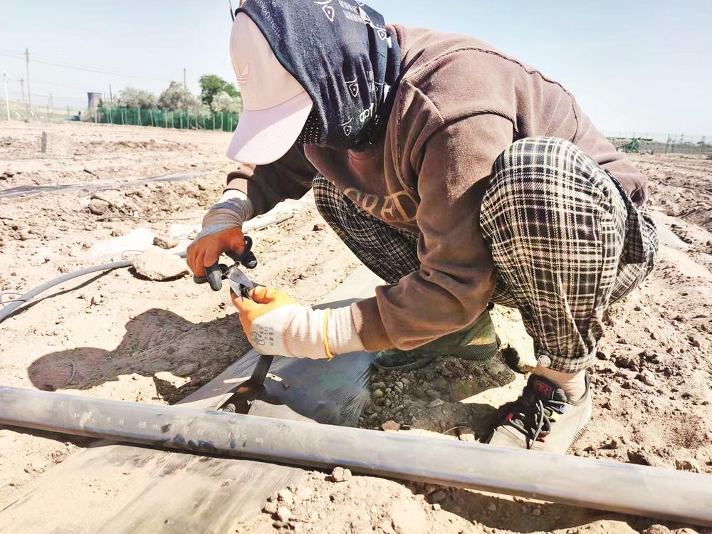 农业生产,水是命脉。今年,三道坎街道胡杨社区牵头成立海江农民专业合作社,在开展葡萄产业示范园建设过程中引进管道输水、覆膜灌溉等节水灌溉系统,确保农业项目实现节水增产效果。图为该合作社产业工人在示范园铺设地面节水灌溉管道。 (作者:路静;编辑:段继文)