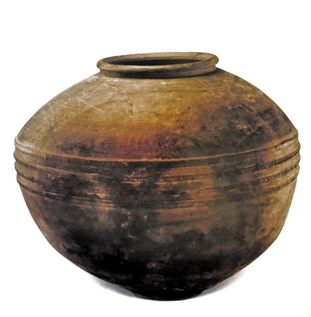 西汉绳纹灰陶罐 这件断代为西汉时期的泥质灰陶罐出土于新地古城遗址,体积硕大,高度达75.5厘米,腹径83厘米,平口卷沿,应当是当时的居民储存粮食用的实用器物。