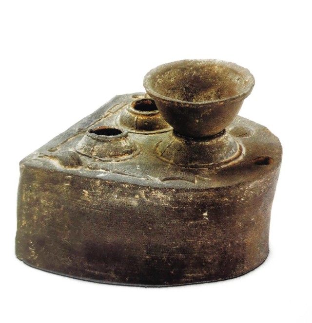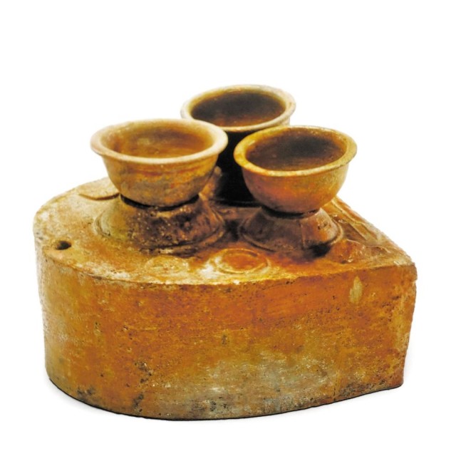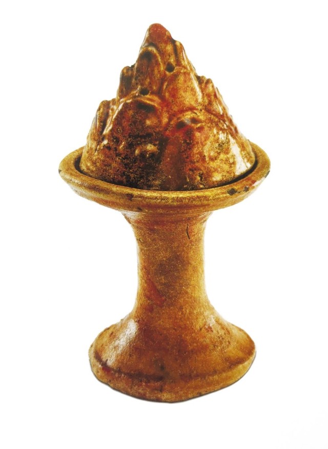 汉代黄釉陶博山炉 该博山炉出土于海勃湾区三坝墓葬群。这个博山炉造型古朴,黄褐色,外刷黄釉。 博山炉是一种香炉,出现于西汉中期,是汉、晋时期常见的焚香用具,因盖上雕镂有象征海上仙山的“博山”而得名,是汉代道家思想盛行在生活器具上的具体呈现。