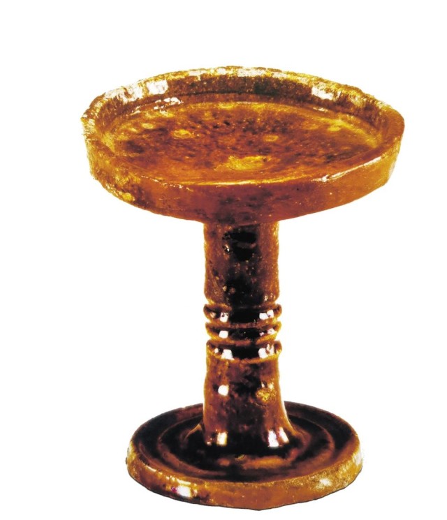 汉代黄釉陶灯 陶灯出土于海勃湾区三坝墓群,红陶泥烧制,表面有黄釉,上为圆形灯盘,下面有长柄,底座平。这种“豆形灯”是我国较早的定型灯具。