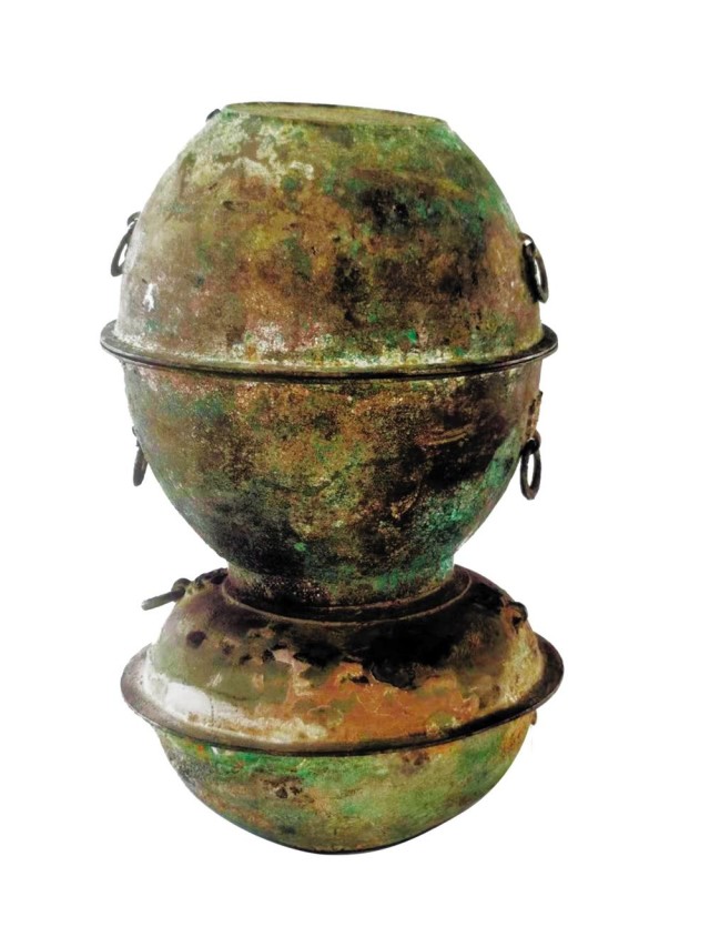 汉代兽面铺首衔环铜甗 甗是一种饪食器,用于蒸熟食物,相当于现在的蒸锅。 这件铜甗(yǎn)由釜、甑(zèng)、盖三部分组成。最下端是釜,肩上有一副对称的兽面衔环铺首,腹中部有一圈宽棱,盛水后可置于灶或火上。甑为敞口,腹上部是对称的衔环铺首,弧腹内收,在底部形成圈足,套扣在釜口外,底部有四组长条形箅(bì)孔,以利蒸汽通过。甑上方覆有钵形盖。