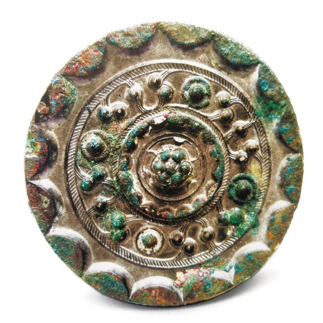 西汉四乳星云纹铜镜 四乳星云纹铜镜出土于海勃湾区新地古城遗址及墓葬群,造型极为经典,镜身为圆形,镜面微凸,镜体厚重。主纹饰区被四枚乳钉纹分隔成4个区域,每区有五个小乳钉纹,并以曲线连接,其形似星云图,其外又是一圈栉齿纹,铜镜边缘亦是一圈内向十六连弧纹,与钮座外的连弧纹相一致。