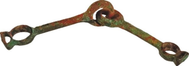 在市博物馆的展柜中,有许多青铜制品,其中就有一只青铜马衔。中间套接两环呈圆形,衔杆粗长,外环由两个环状组成,一个圆的,一个梯形的。
