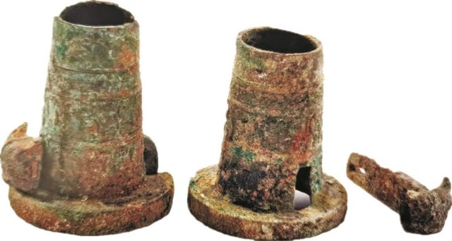 市博物馆里的青铜軎(wèi)辖,就是装饰这种马车用的东西,出自战国时期,它的造型像个长长的圆筒,正面还有一个威风凛凛的兽头,留着穿皮带的孔,可以用皮革穿着固定在车轴上。