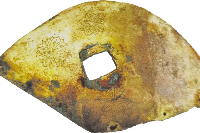 当卢为古代贵族驾乘之马额头上的饰物,通常在马的额头中央偏上部,通过额带固定在马鼻革与额革的交接处。当卢可是非常炫酷的“马面具”,有装饰和防护两种作用。博物馆里的这件铜制当卢表面鎏金,下端细长,能很好地贴合马的鼻梁,但又不至于遮挡视线。当卢的四周边缘还有一圈穿管小摇叶,现在大部分都已经脱落了,仅有部分穿管附着在当卢上。