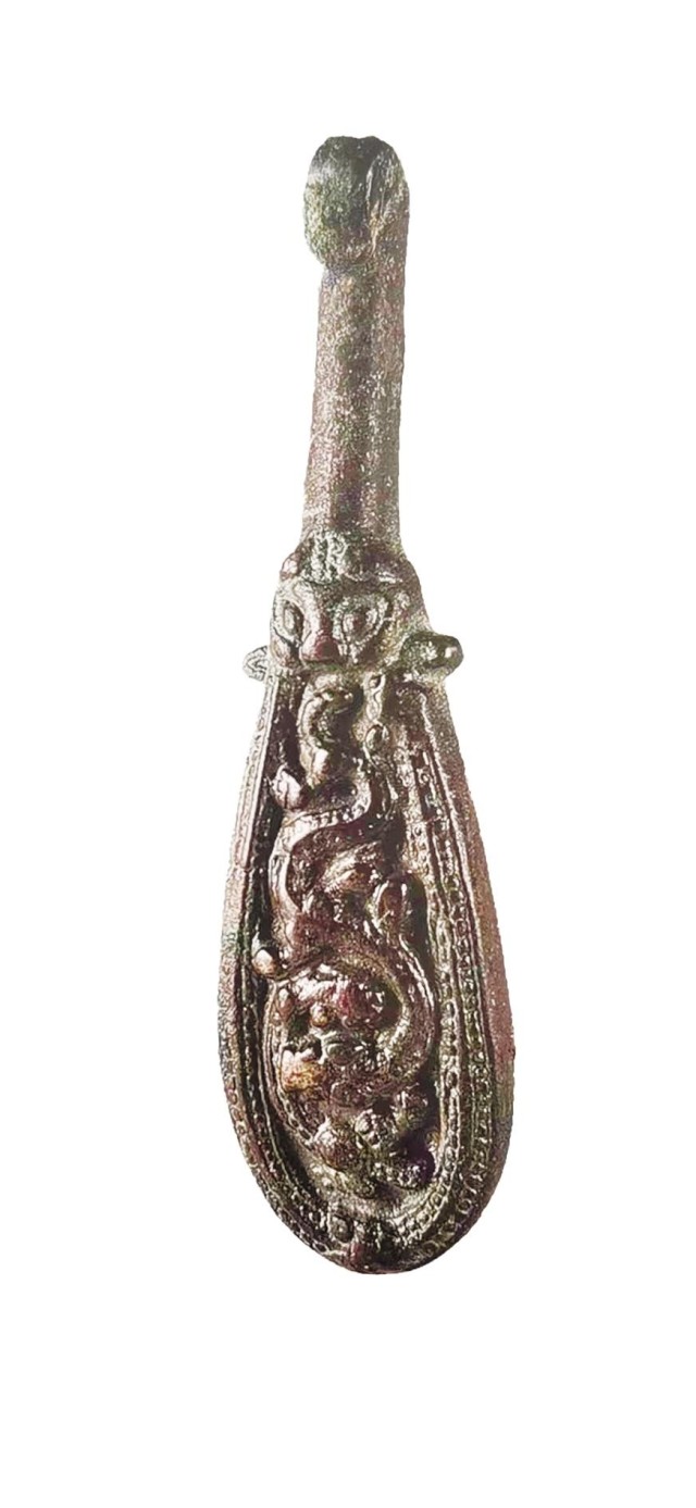 还有一件出自战国时期的螭纹铜带钩也是琵琶造型,钩首为回望的蛇首,正面居中有兽面,钩尾浮雕着四只小螭,两只围绕钩尾边缘首尾相接,其余两只则蜿蜒相对,钩尾呈短柱形,工艺精美,令人赞叹。