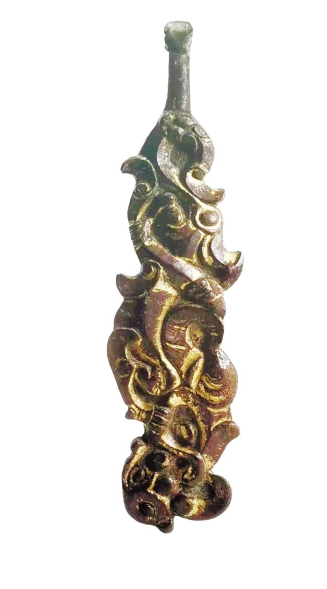 此外,还有一件错金嵌玉铜带钩。这件带钩的造型是战国时期较为常见的琵琶造型,体型较大,钩身厚重,目前布满锈沁。其首为蛇,钩身侧面呈弧形,正面几何纹镶嵌有绿松石,规律地点缀着错金圆点,工艺繁复。钩尾呈圆弧形,钩纽为圆形短柱居于后方,置于钩身3/4处。