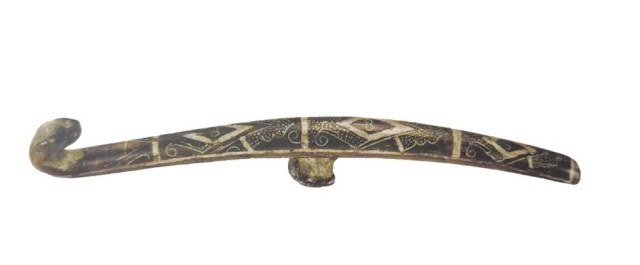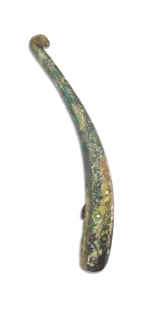 带钩的历史源远流长,不仅为日常生活所需,亦是身份地位的象征,不同时代的带钩还能呈现出不同的社会文化背景,具有很高的历史价值、艺术价值和考证价值。带钩的制作材料一般以铜、铁为主,也有部分使用黄金、白银、玉、石、木等材质。普通带钩由钩、颈、体、钮四部分组成,按其与人体相接触的适应程度,可分为弧形钩和直形钩两类。