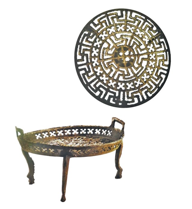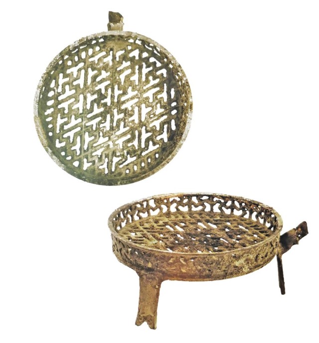 第一件是一只出自元代的“卍”字纹铁柄铜火盆。盆口沿微侈,浅直腹,平底。盆底和壁皆装饰镂空“卍”字纹,为的是便于漏灰旺火。盆下有三扁足,足末端有三角形缺口,这种工艺设计可以大大地增大其与地面的接触面积,使之更为稳固。盆壁与足的结合处有一銎管,銎管内连接着一截残断的铁执柄,应是分别铸造焊接而成。