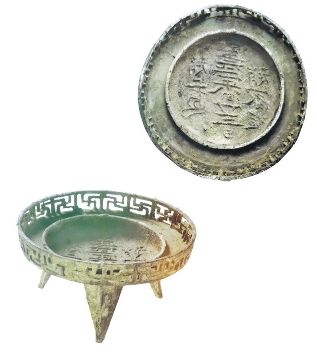 第三件铜火盆与前两件都有所不同,它的特点在于:这是一件有“商标”的火盆。这个火盆同样为圆形敞口,盆壁一周镂空“巴”字纹,盆内另铸有连体内盆,盆下是3个锥形足。盆底筑有竖排3列铭文,内容从左向右为“趙二□二年八月廿二日趙家造”。