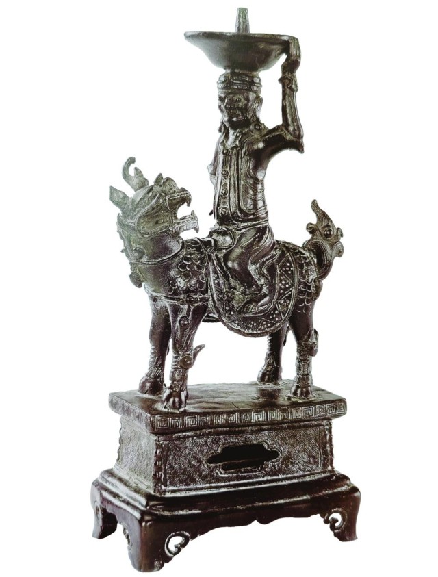 神兽獬豸也有特别的含义。獬豸是中国古代神话传说中的神兽,拥有很高的智慧,懂人言知人性。它怒目圆睁,能辨是非曲直,能识善恶忠奸,发现奸邪,就用角把他触倒,然后吃下肚子。它能辨曲直,又有神羊之称,是勇猛、公正的象征, 烛台中用獬豸的形象,也有“正大光明”“光明天下”等寓意。