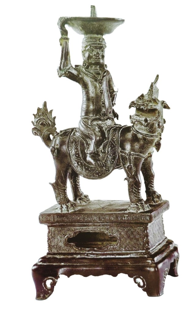 烛台在我国古代是非常重要的照明用具,也是一种佛前供器。其历史十分悠久,战国时已有各式精美的铜烛台,三国两晋时期制瓷工艺发展,青瓷烛台出现,并逐渐取代了铜烛台。三国有羊形烛台,西晋有狮形烛台,南朝有四管带座烛台。隋唐时期烛台的造型更加丰富。明宣德时期有青花八方烛台,烛台上置蜡烛形插柱。正德时期的烛台基本保持明初烛台之结构,清代仍沿袭这一器形。