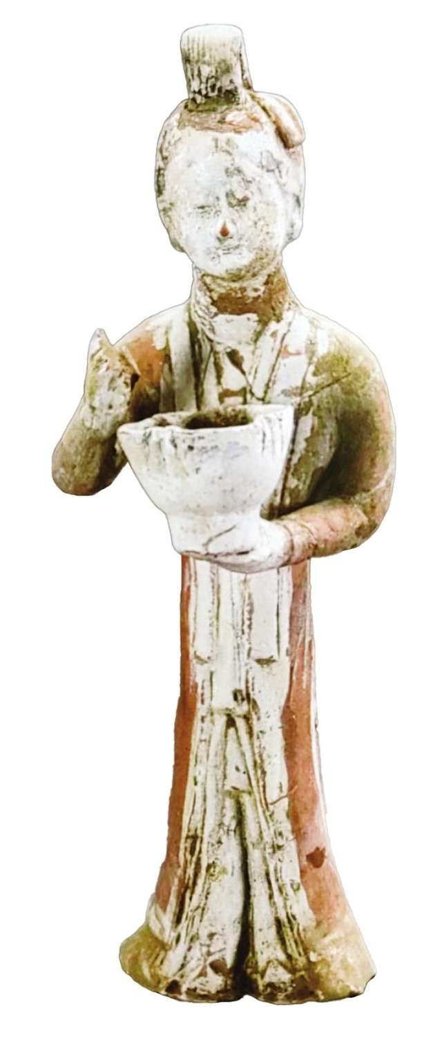 女俑则头梳高髻,五官清秀,发髻处有贴金,身姿纤细,穿窄袖长裙,肩披帔帛,自然下垂于胸前,下穿曳地多褶长裙,足穿白色尖头履,左手托举一只高足四瓣葵口碗,右臂屈肘于身前。