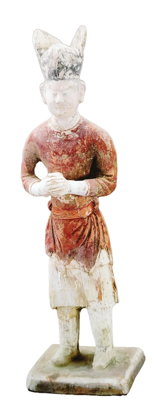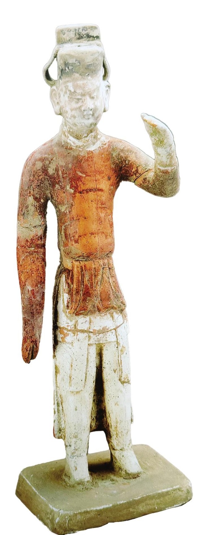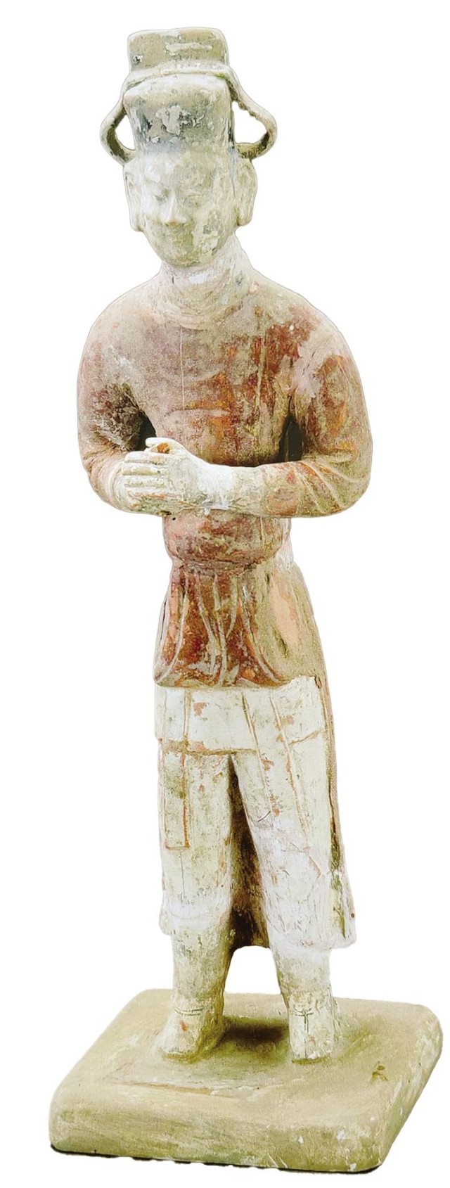 第三个男俑头戴黑色幞头,内穿右衽白色内衫,外穿赭黄圆领窄袖袍,前襟上卷,折入革带内,露出白色长裤,足穿短靴,双手拱于胸前,手中也应持有笏板。
