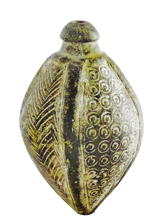 这个尖底瓶是石质,内部空间非常狭小。关于它是做什么使用的,有两种猜测,一种疑似是祭祀活动中吹奏的乐器。另一种猜测则是祭祀时盛放药水的器物。