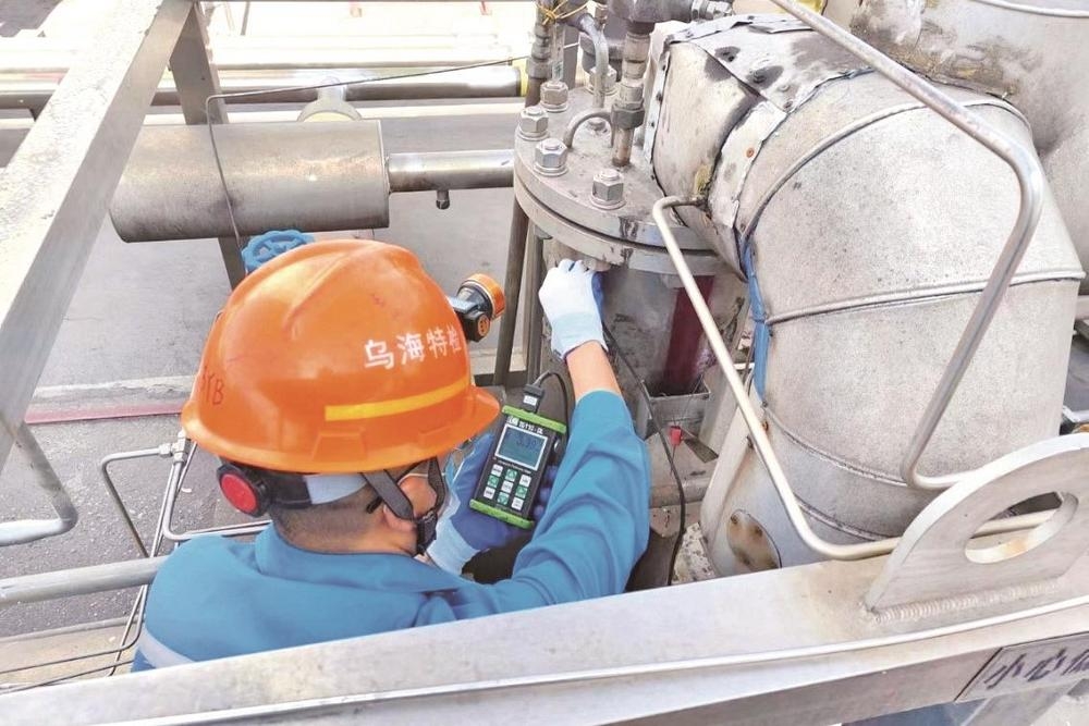 近日,内蒙古特检院乌海分院检验人员主动对接企业,对企业特种设备各部位、运行使用各环节进行现场检查和资料核查,并对特种设备使用维护提出指导意见。图为检验人员检测压力容器壁厚(渗透)。 (作者:黄建飞;编辑:段继文)