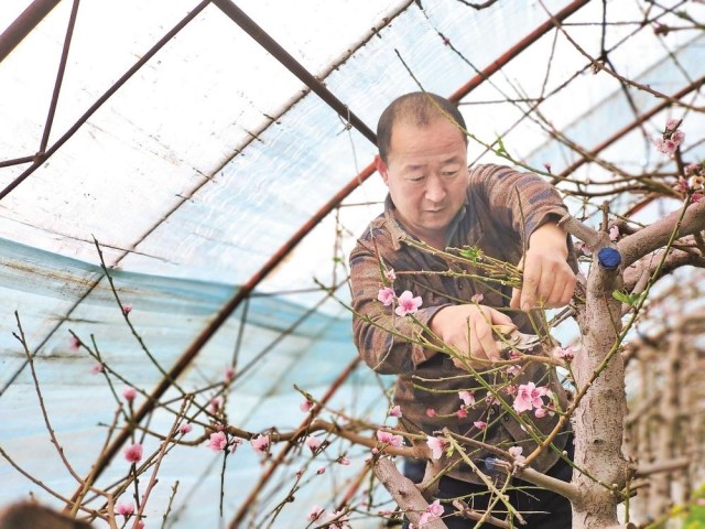 2月8日,在团结新村美丽桃园,经营者卢美丽正在大棚内修剪桃树。看着一树树桃花朵朵开放,卢美丽两口子的脸上满是笑容。