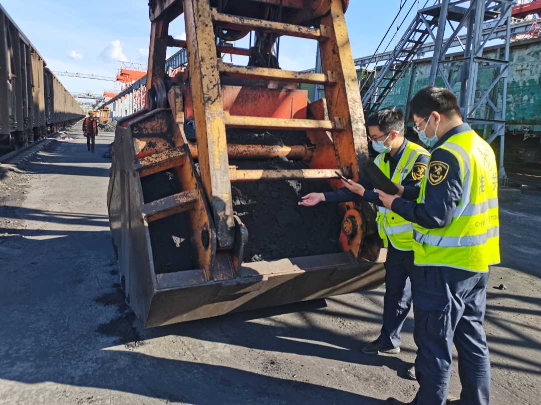 满洲里车站海关关员对进口铁精矿开展现场查验。通讯员 任艳强摄