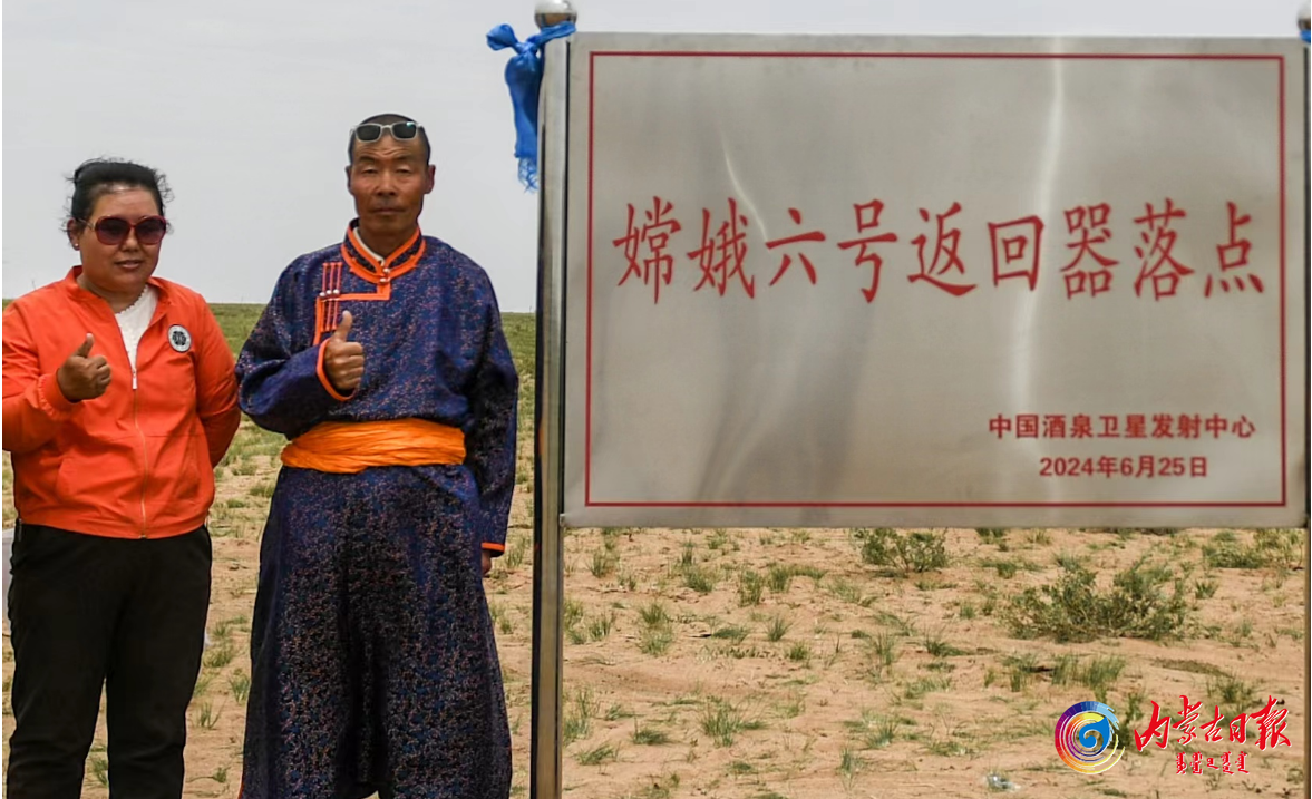 特木尔巴特尔和妻子在嫦娥六号返回器落点合影留念。