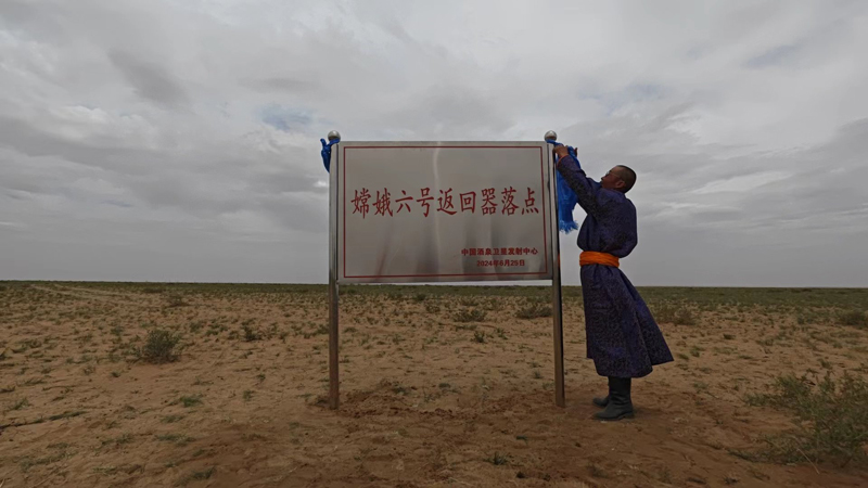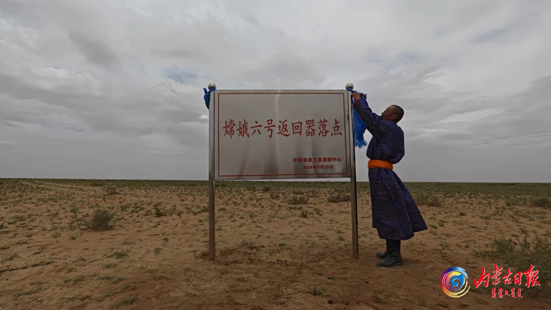 特木尔巴特尔为嫦娥六号返回器落点标志牌系上哈达。