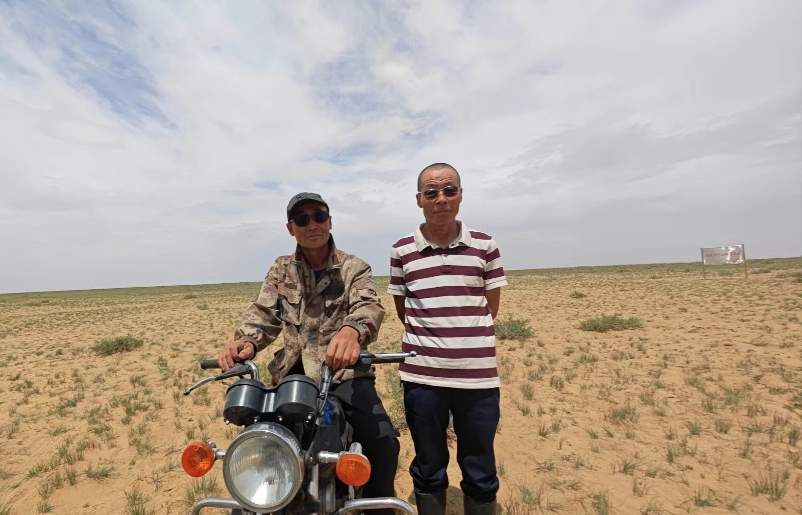 在标志牌前,特木尔巴特尔特意换上了节日盛装,在标志牌两侧庄重地系上了蓝色的哈达,并和妻子合影留念。