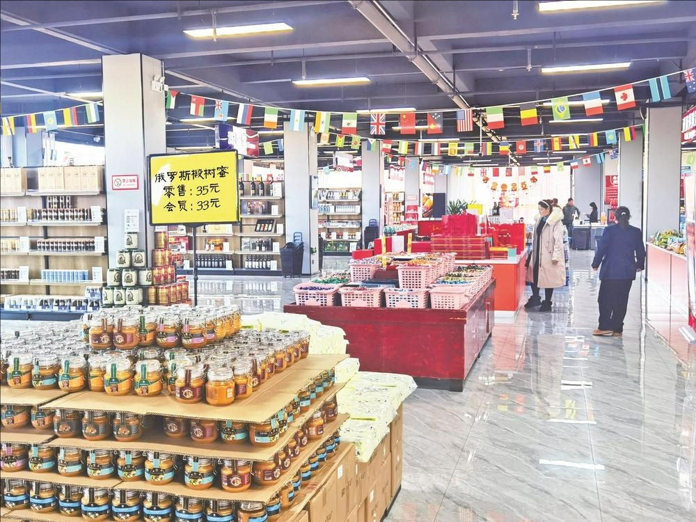 2月14日,中蒙俄特色贸易区进出口商品体验中心,顾客挑选喜欢的商品。这里有异国特色的酒水、生鲜、休闲食品、日化、小家电、服装等,汇聚了来自30多个国家的上千种商品,给顾客带来了不一样的购物体验。 (鲁吟 摄)
