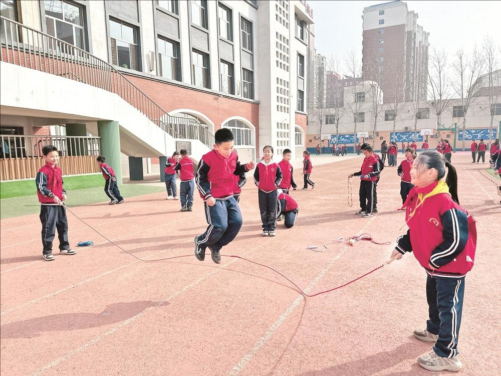 从2025年春季学期开始,按照《内蒙古自治区教育厅关于落实中小学生每天2小时综合体育活动的通知》要求,我市各中小学校纷纷以实际行动为体育活动“加时加量”,让孩子走出教室、享受阳光、健康成长。图为海勃湾区第五小学的孩子们利用大课间在操场上跳绳。(郑彩虹 摄)