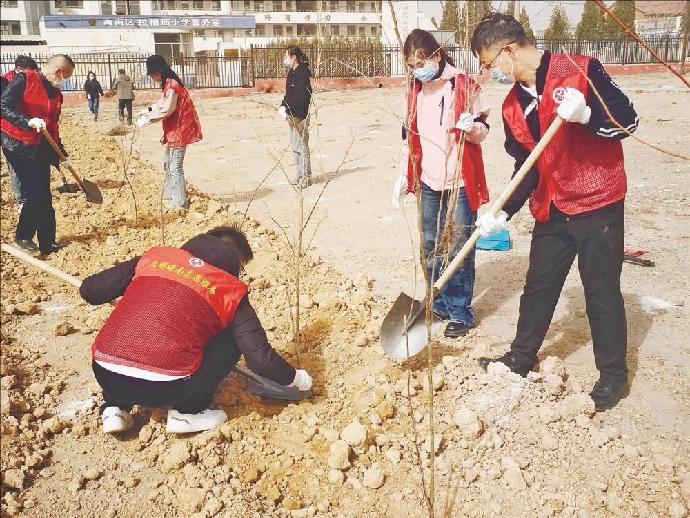 近日,海南区开展“党建引领聚合力 义务植树践初心”主题活动。全区60余家单位、1000余名党员干部参与其中,大家热情高涨,干劲十足。 植树现场,林业技术人员现场教学,党员干部挥锹铲土、扶苗填坑,累计种下3000余株沙枣树。活动还创新建立“支部认领+党员包片”责任制,划分党员示范林区,确保苗木成活率达到95%以上。(刘春霞 摄)