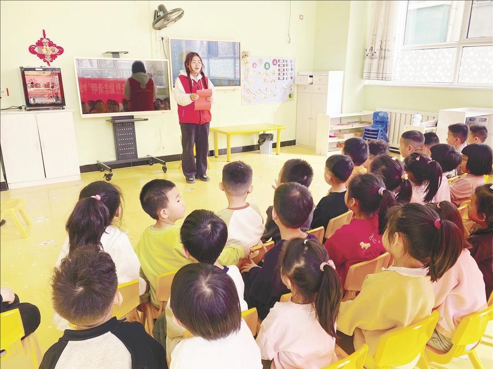 4月2日,海勃湾区海北街道青山社区关工委联合卡酷幼儿园开展“缅怀先烈 励志清明”中华经典诵读活动。社区志愿者通过讲述清明节的来历、习俗以及革命先烈的英勇事迹,让孩子们了解清明节的文化内涵,也让他们在红色文化的滋养下,增强爱国情感和民族自豪感。(王婷 摄)