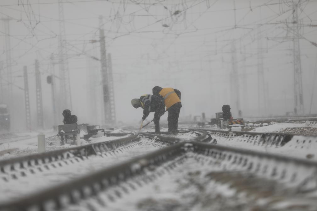 4月12日,中国铁路呼和浩特局集团有限公司锡林浩特综合维修段组织职工清理锡林浩特站道岔积雪。新华社发
