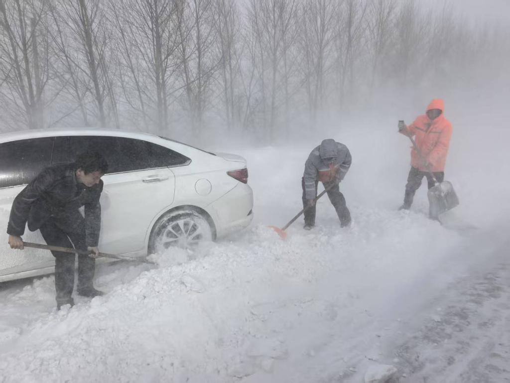4月12日早晨,赤峰市林西县交通运输局组织力量对境内国道306线受困车辆进行救援。新华社发