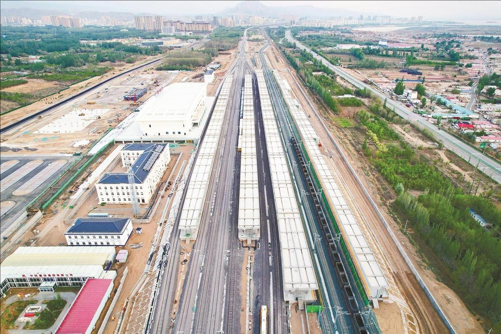 乌海站是包银高铁全线最大的新建站。站房整体设计为雄鹰展翅造型,地上2层、地下1层,建筑面积约10000平方米,旅客地道建筑面积约5795平方米。站场设计规模4站台11线,其中1、2站台为高速站台,3、4站台为普速站台;8至11线为包兰铁路,于2024年9月10日完成拨接;1至7线为包银高速铁路,于5月7日完成铺轨施工。(黄建飞 摄)