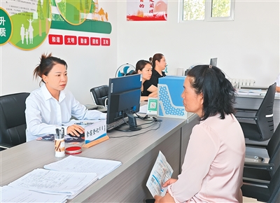 在内蒙古鄂尔多斯市伊金霍洛旗零工市场,工作人员(左)正为老乡办理就业服务相关手续。