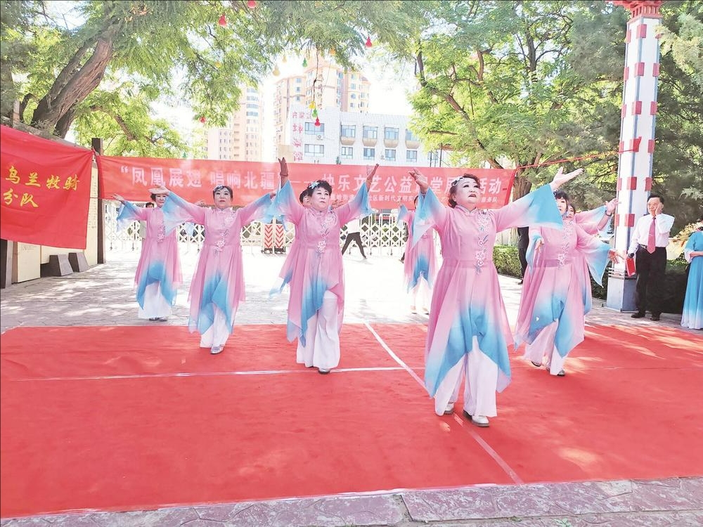 近日,海勃湾区凤凰岭街道联合辖区文化志愿服务队,在市人民公园东门举办“凤凰展翅 唱响北疆”快乐文艺公益课堂展演,丰富了居民的业余文化生活,有效增强了辖区居民的凝聚力与向心力。 (张楚研 摄)