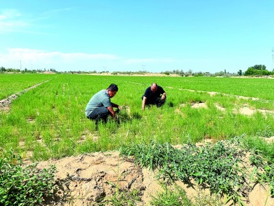 巴彦淖尔市磴口县防沙林林业管护中心工作人员在梭梭育苗田里除草。本报记者 杨桐彤摄/光明图片