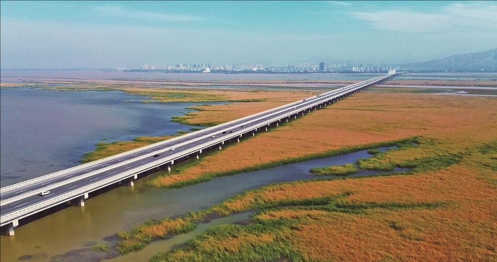 航拍镜头下,乌海湖大桥架于黄河岸畔的湿地之上;湿地中,金黄的芦苇与远处蓝天交相映衬,共同勾勒出一幅壮阔的湿地秋景图。(赵政宇 摄)