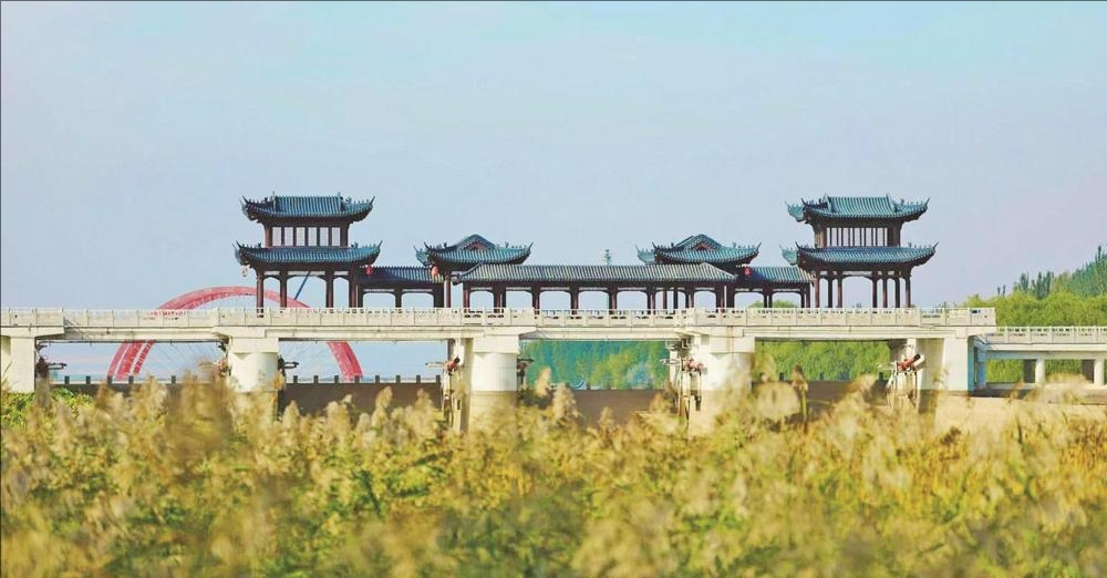 秋风吹过甘德尔河,河道内金黄的芦苇轻柔起舞,与桥上的亭阁、远处的树木、彩虹桥,在蓝天下相互映衬,形成层次分明的画卷,营造出静谧而梦幻的氛围。图为海勃湾区甘德尔河一景。(赵政宇 摄)