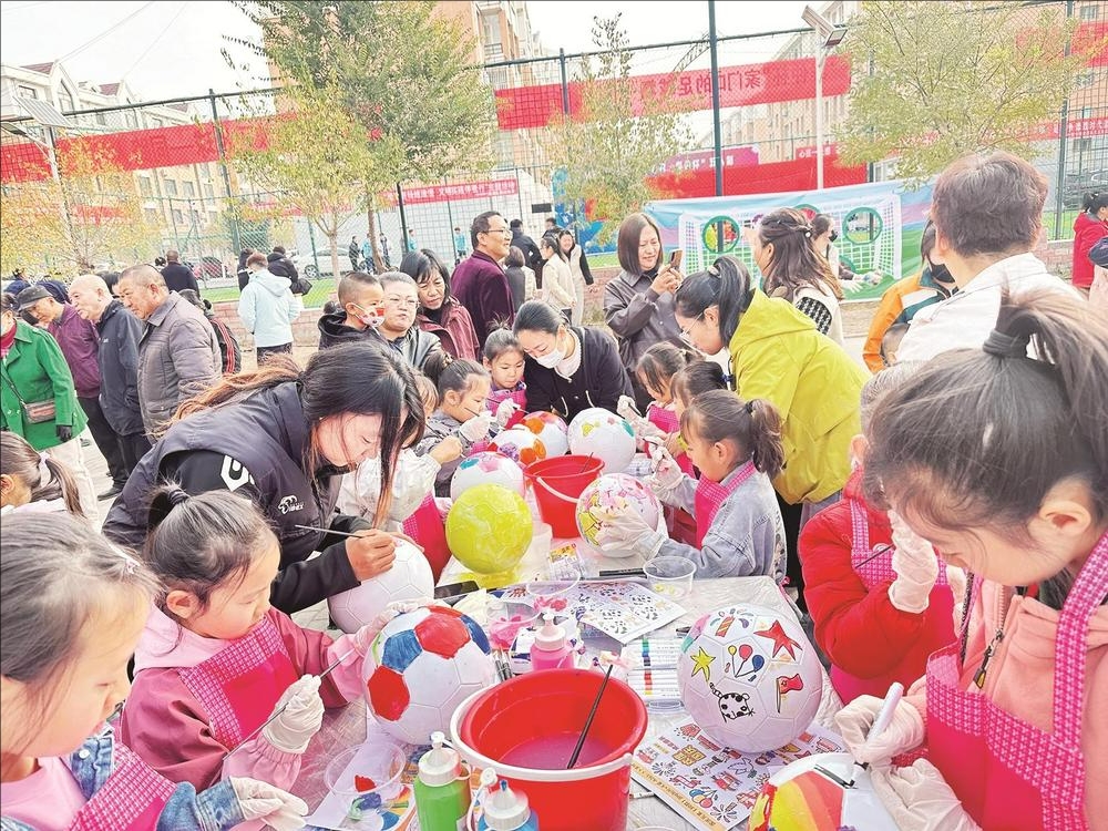 近日,海南区五人制社区足球超级联赛激烈进行,同步启动的“幸福集市”成为市民关注焦点。集市以足球为主题,融合政策宣传、运动科普与趣味互动,为市民提供了一站式休闲体验,让运动与生活温情相连。图为“幸福集市”互动区,市民积极参与足球主题游戏。(刘春霞 摄)