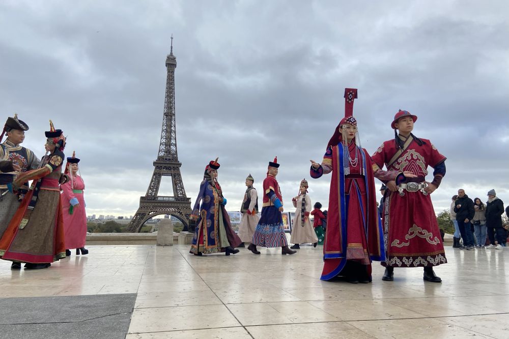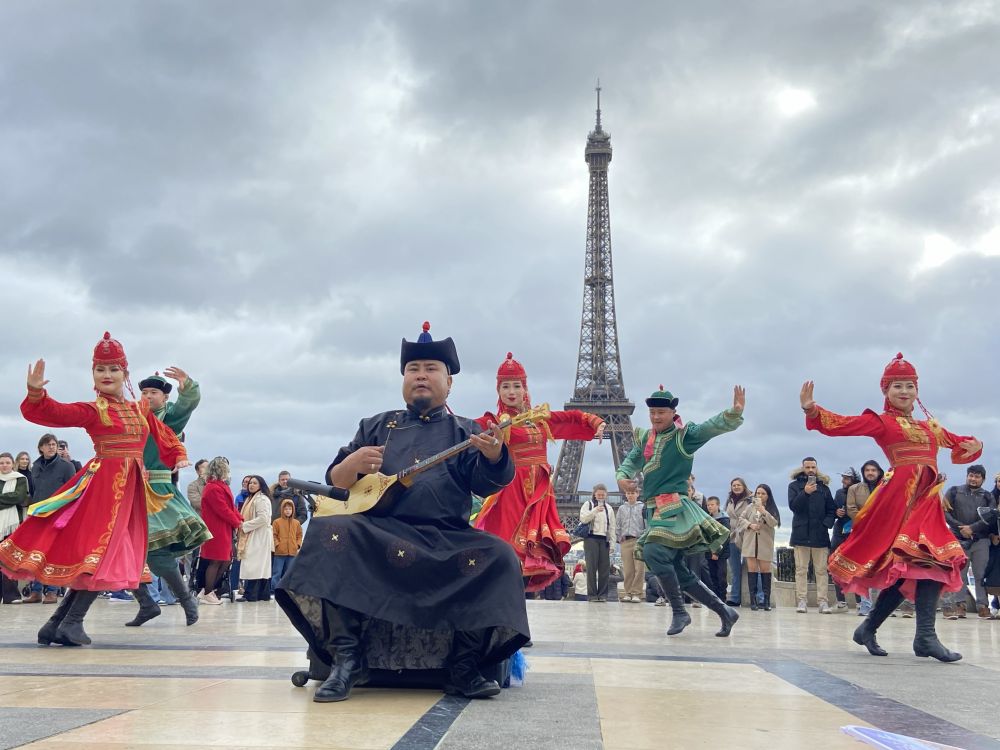 10月28日,在法国巴黎,来自内蒙古自治区阿拉善盟的乌兰牧骑演员身着盛装在埃菲尔铁塔附近进行“快闪”表演。新华社记者 乔本孝 摄