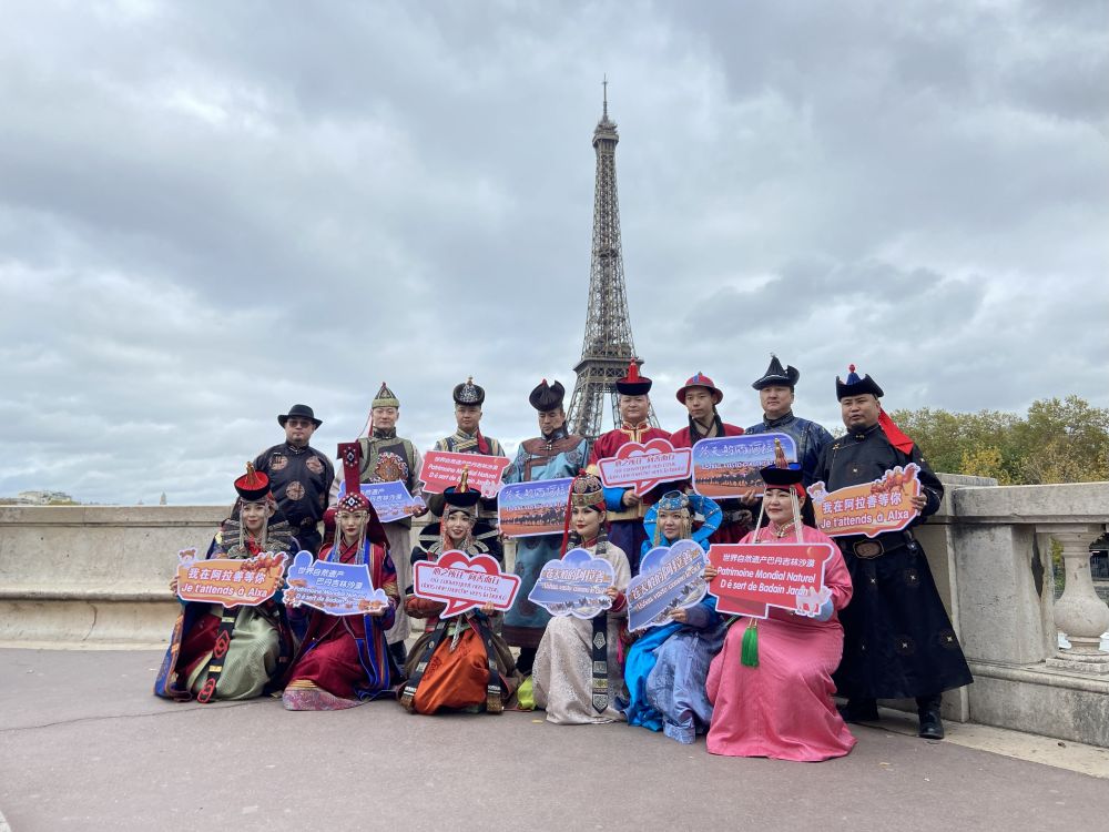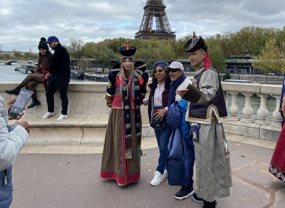 10月28日,在法国巴黎,来自内蒙古自治区阿拉善盟的乌兰牧骑演员与游客互动合影。新华社记者 乔本孝 摄