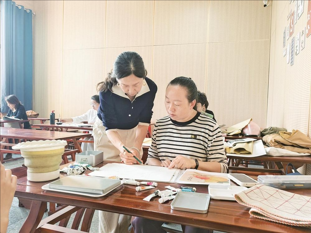 近年来,乌达区不断丰富居民精神文化生活,持续开设形式多样的文化公益课堂,推动文化惠民工程走深走实。图为公益课堂上,老师指导学生练习绘画。 (张丽阳 摄)