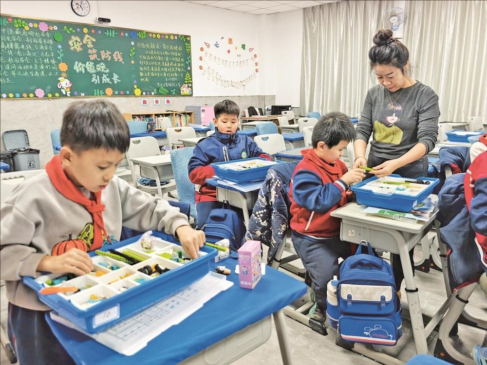 为丰富校园文化生活,发展学生的兴趣与特长,促进学生的全面发展,乌达区幸福街小学开设了特色社团课程,学生可依据自己的兴趣爱好及自身特长,自主选择社团活动。图为AI人工智能课上,学生正在用积木搭建模型。 (张丽阳 摄)