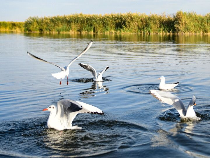 2025年9月25日,候鸟在巴彦淖尔市乌梁素海湖面嬉戏、觅食。康文魁 摄
