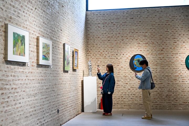 5月4日,游客在位于回民区西乌素图村的“回”空间创意展示中心观展。新华社记者 李志鹏 摄