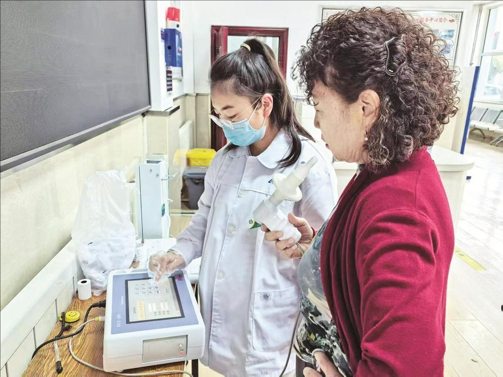 近日,海勃湾区海北街道办事处社区卫生服务中心开展了免费肺功能检测服务,检测面向有呼吸道症状、肺部疾病等人群,为肺部疾病的早期诊断、病情评估和疗效监测提供关键依据。 近年来,我市持续深化公共卫生服务体系建设,不断拓展服务内容、提升服务质量,让国家基本公共卫生服务项目真正落地见效,以实实在在的健康保障,提升群众的获得感、幸福感和安全感。图为辖区居民在医护人员指导下进行肺功能检测。(鲍维 摄)