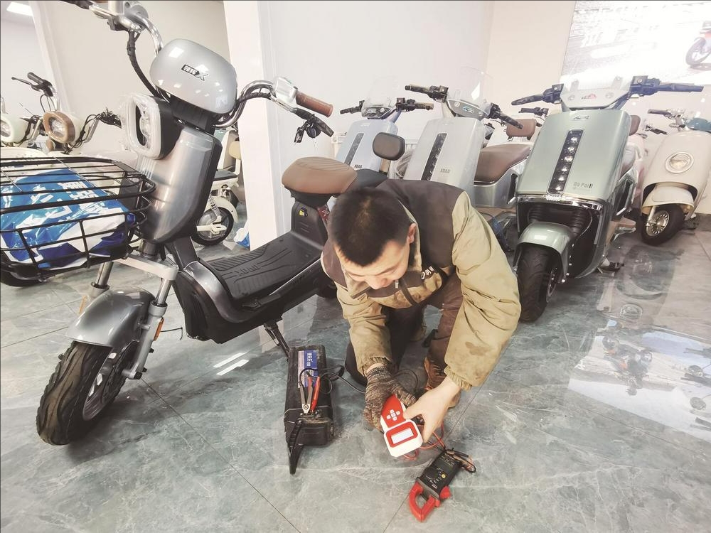 近日,海南区首家电动自行车锂离子电池健康评估网点在小刀电动车门店正式挂牌,标志着电动自行车安全治理迈向精细化、源头化。图为专业工作人员通过专用设备对电池的容量衰减、充放电稳定性、内部电芯状态等指标进行全面检测,及时排查鼓包、漏液、过热等安全隐患,并为居民提供电池维护、更换建议。 (鲁吟 摄)