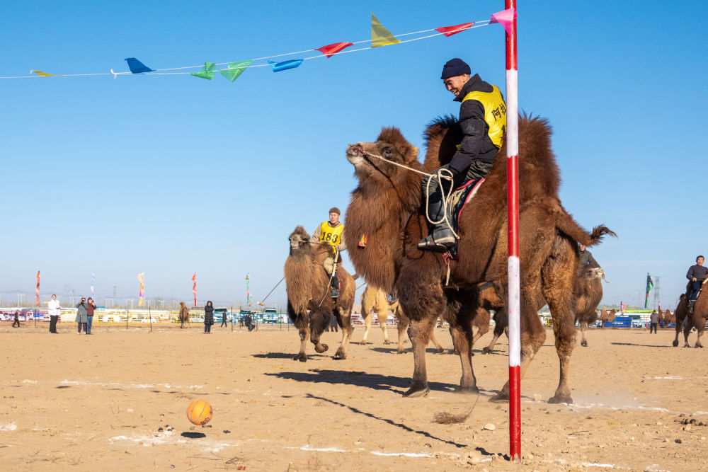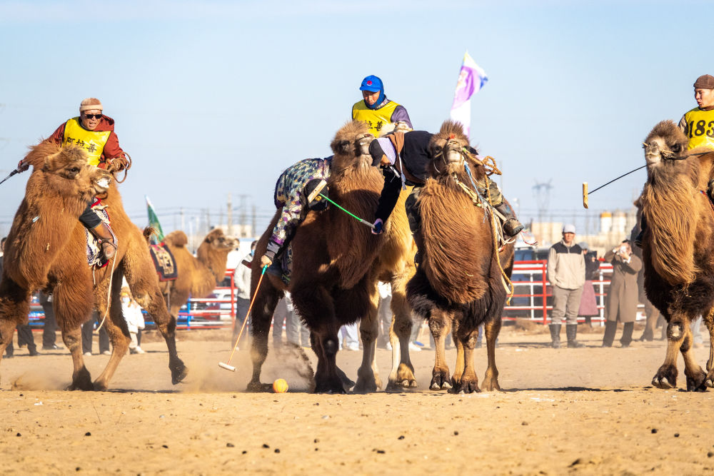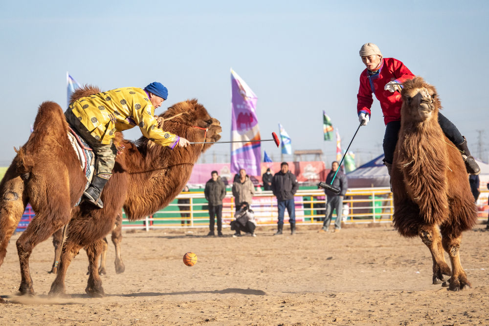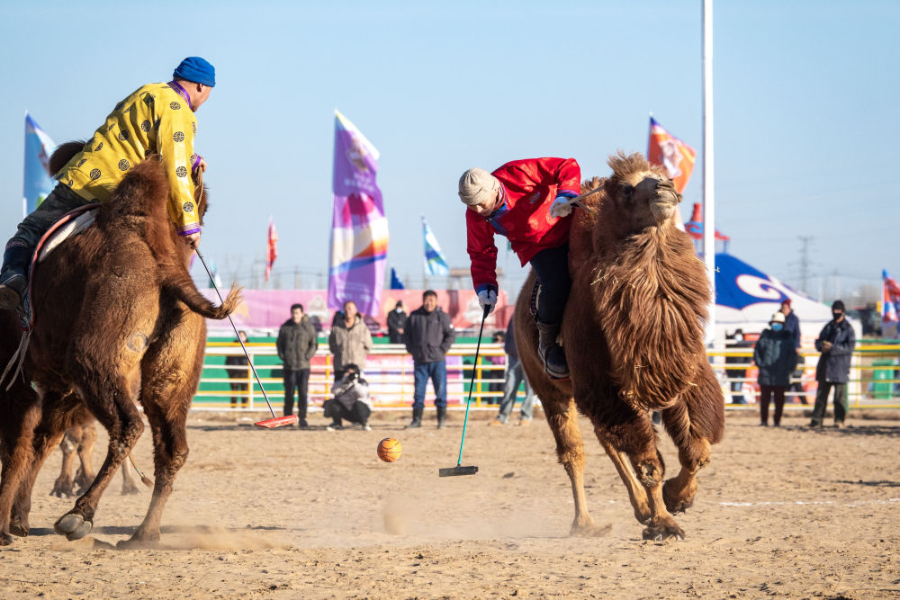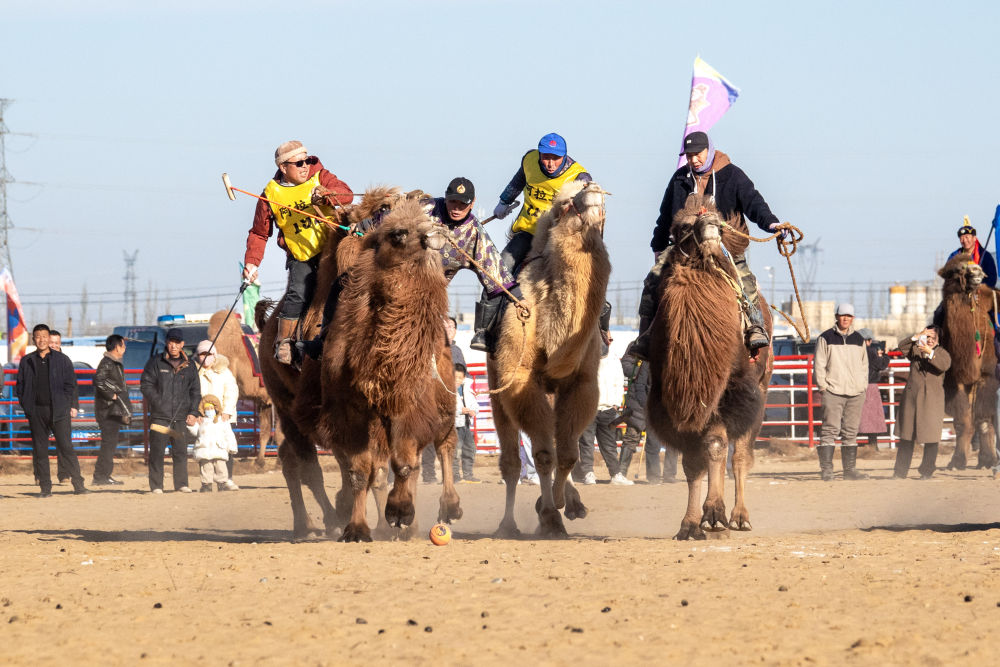 12月28日,选手策驼挥杆、激烈竞逐,呈现别具特色的骆驼运动风采。