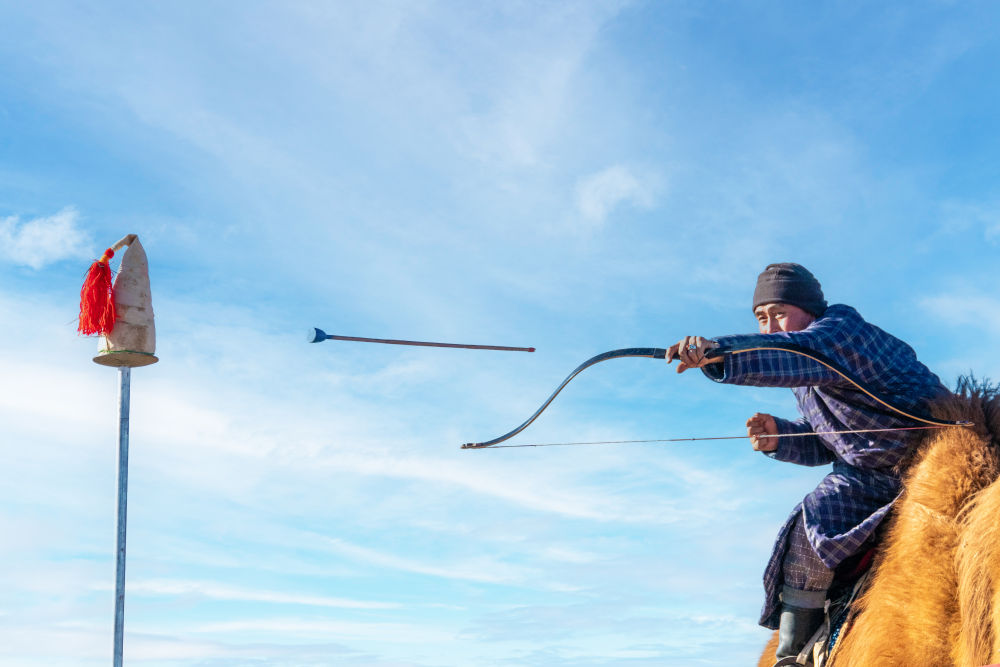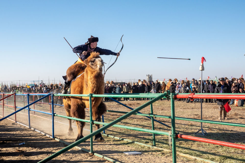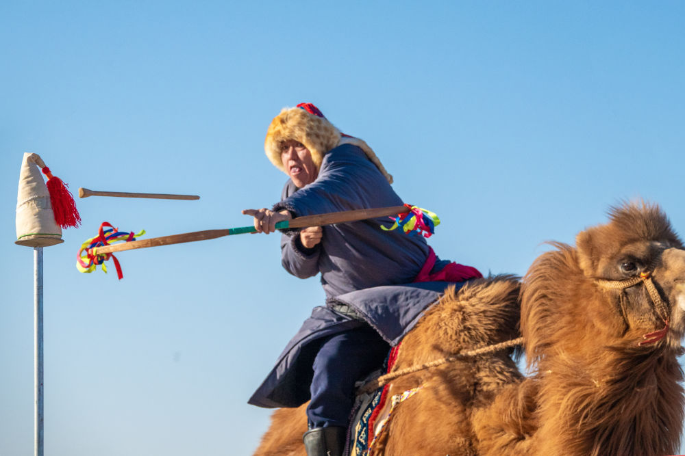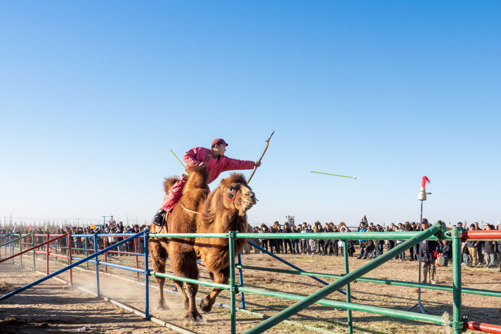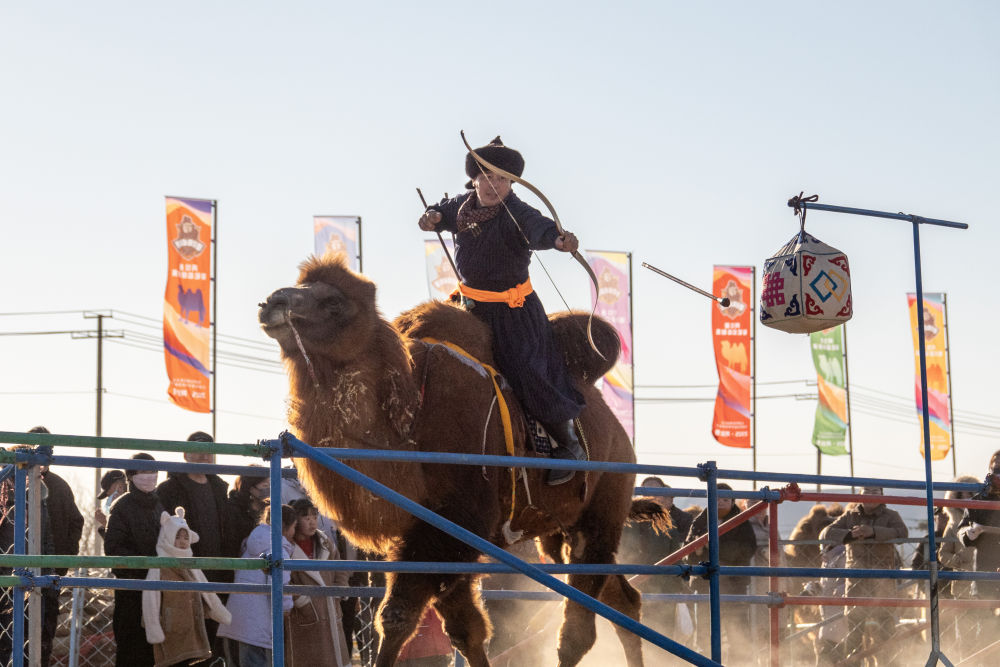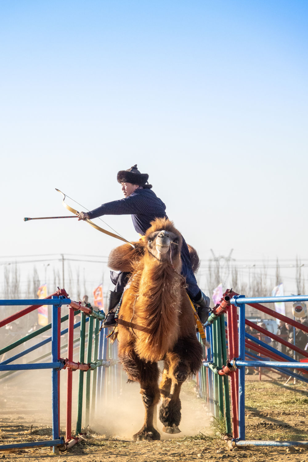 12月28日,骑手在骆驼超级联赛乘驼射箭比赛中疾驰张弓,展现传统骑射技艺。